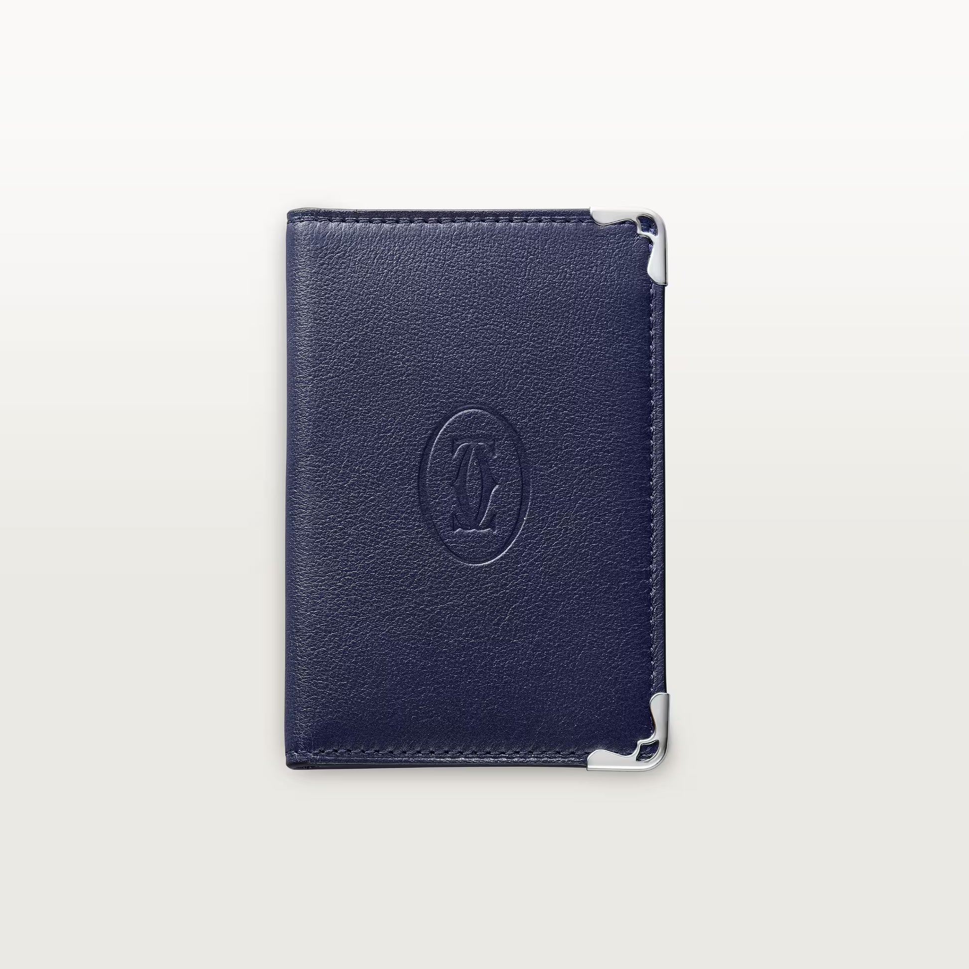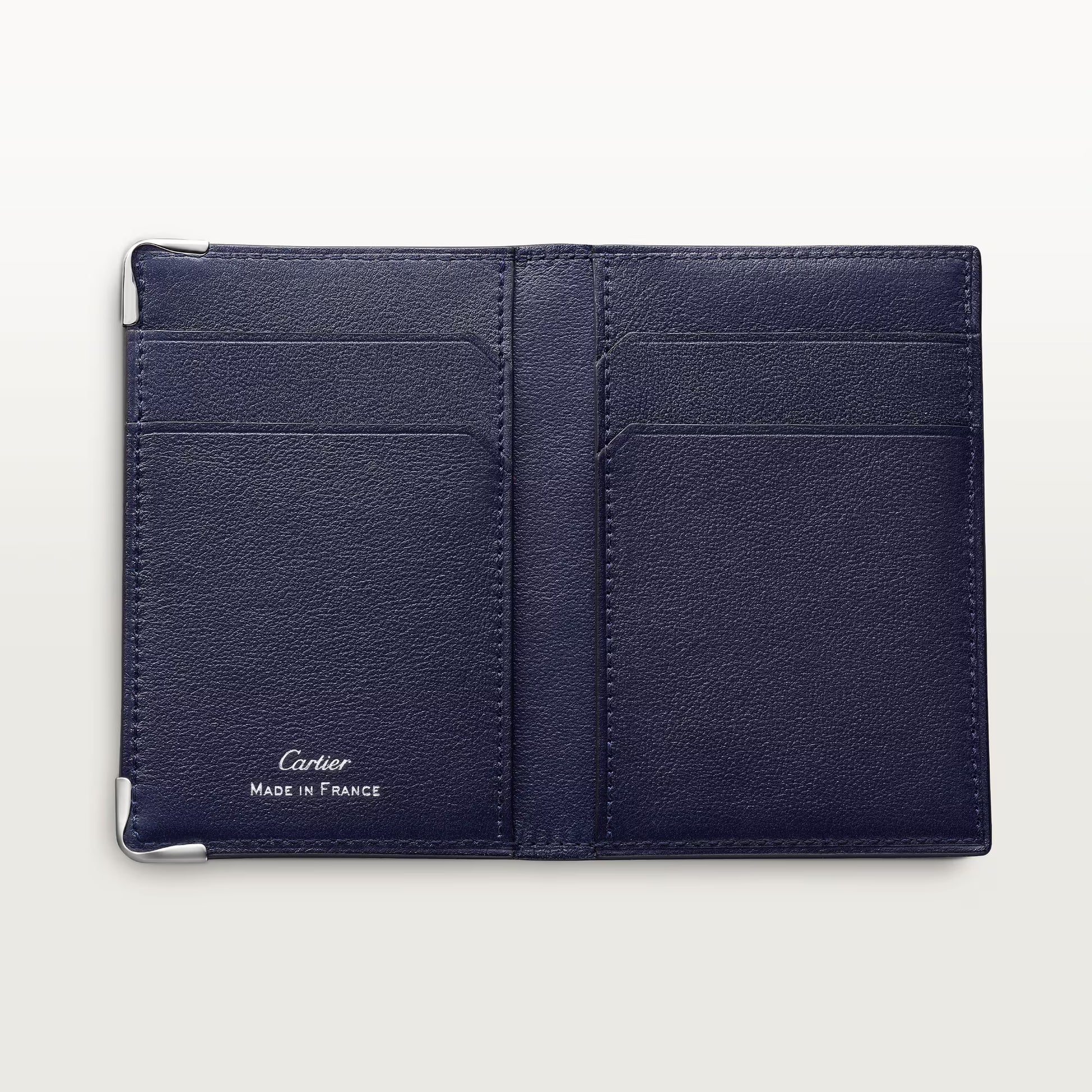 إصدار محدود. حاملة بطاقات ائتمان من جلد العجل الأزرق. من الخارج: شعار C مزدوج منقوش، وزوايا معدنية من الفولاذ المقاوم للصدأ. من الداخل: جلد عجل أزرق، وعلامة كارتييه فضية اللون، وأربع فتحات لبطاقات الائتمان، وثلاثة جيوب مسطحة. الأبعاد: الارتفاع ١٠٧ مم × العرض ٧١ مم. صُنع هذا الموديل في إيطاليا أو البرتغال.