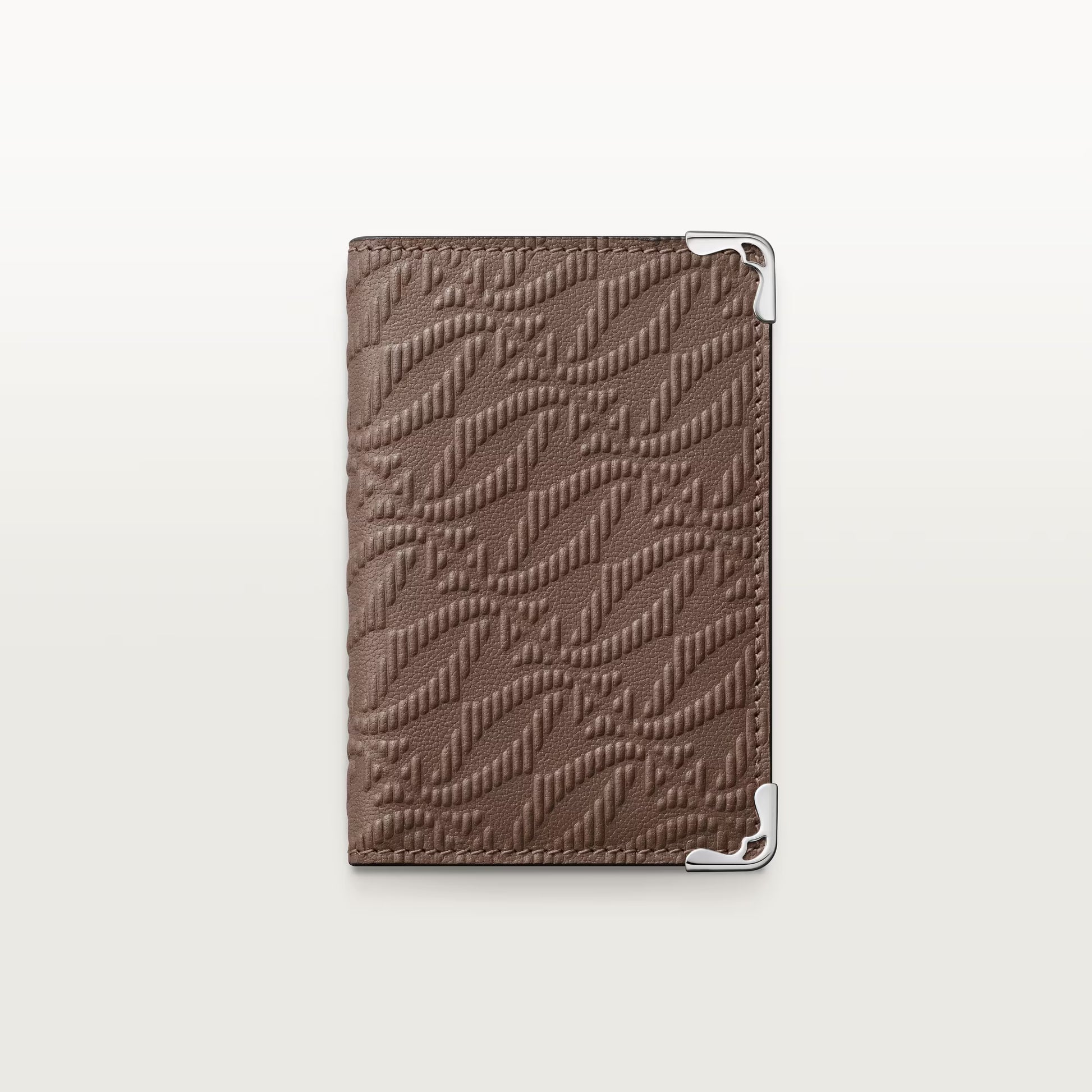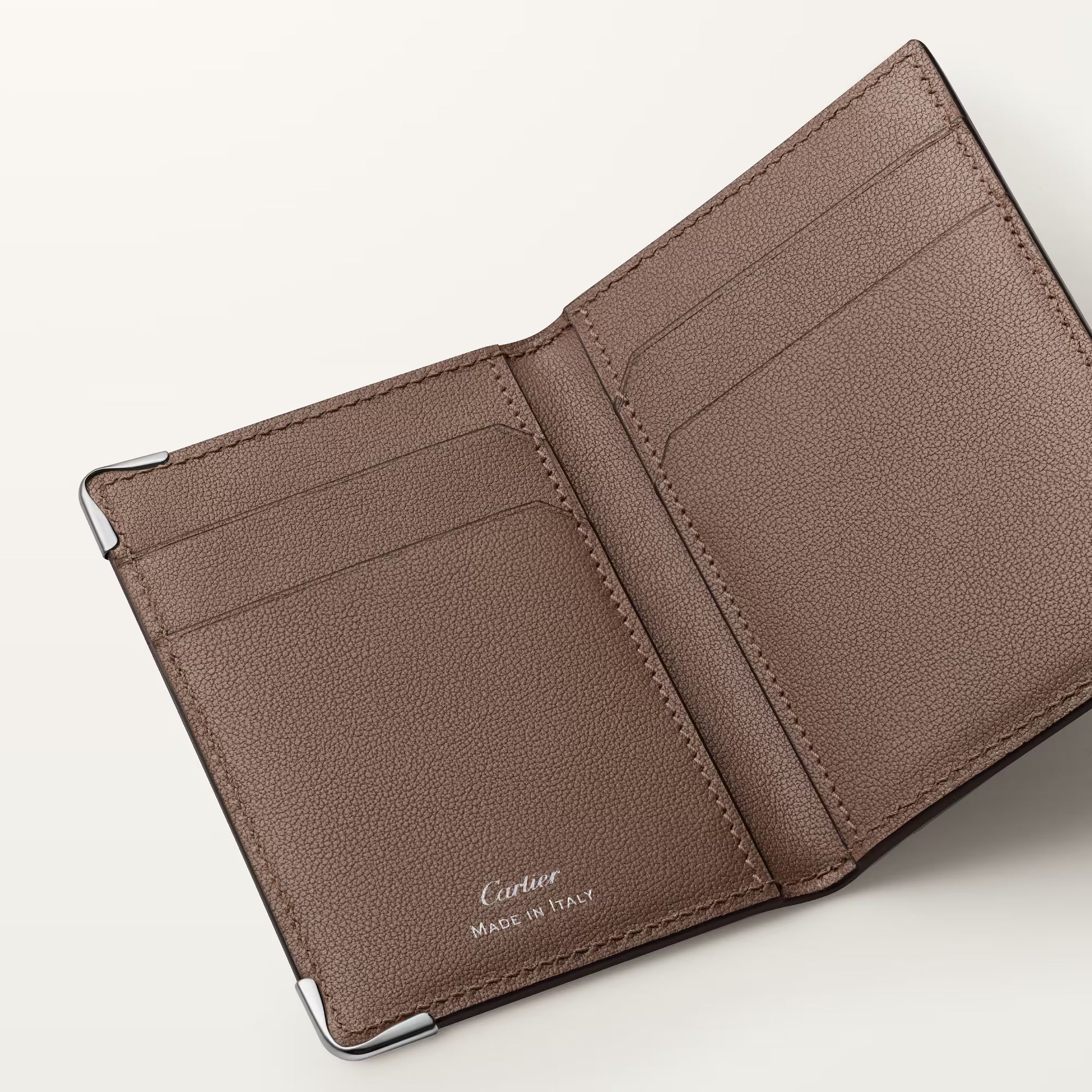 حافظة بطاقات Must 4CC من جلد العجل بلون رمادي باهت، مدبوغة بيولوجيًا، بنقش بارز. الجزء الخارجي: شعار C مزدوج منقوش، زوايا معدنية مطلية بالبلاديوم. الجزء الداخلي: جلد عجل بلون رمادي باهت، توقيع كارتييه فضي اللون، أربع فتحات لبطاقات الائتمان، وثلاثة جيوب مسطحة. الأبعاد: الارتفاع: ١٠٧ مم، العرض: ٧١ مم.