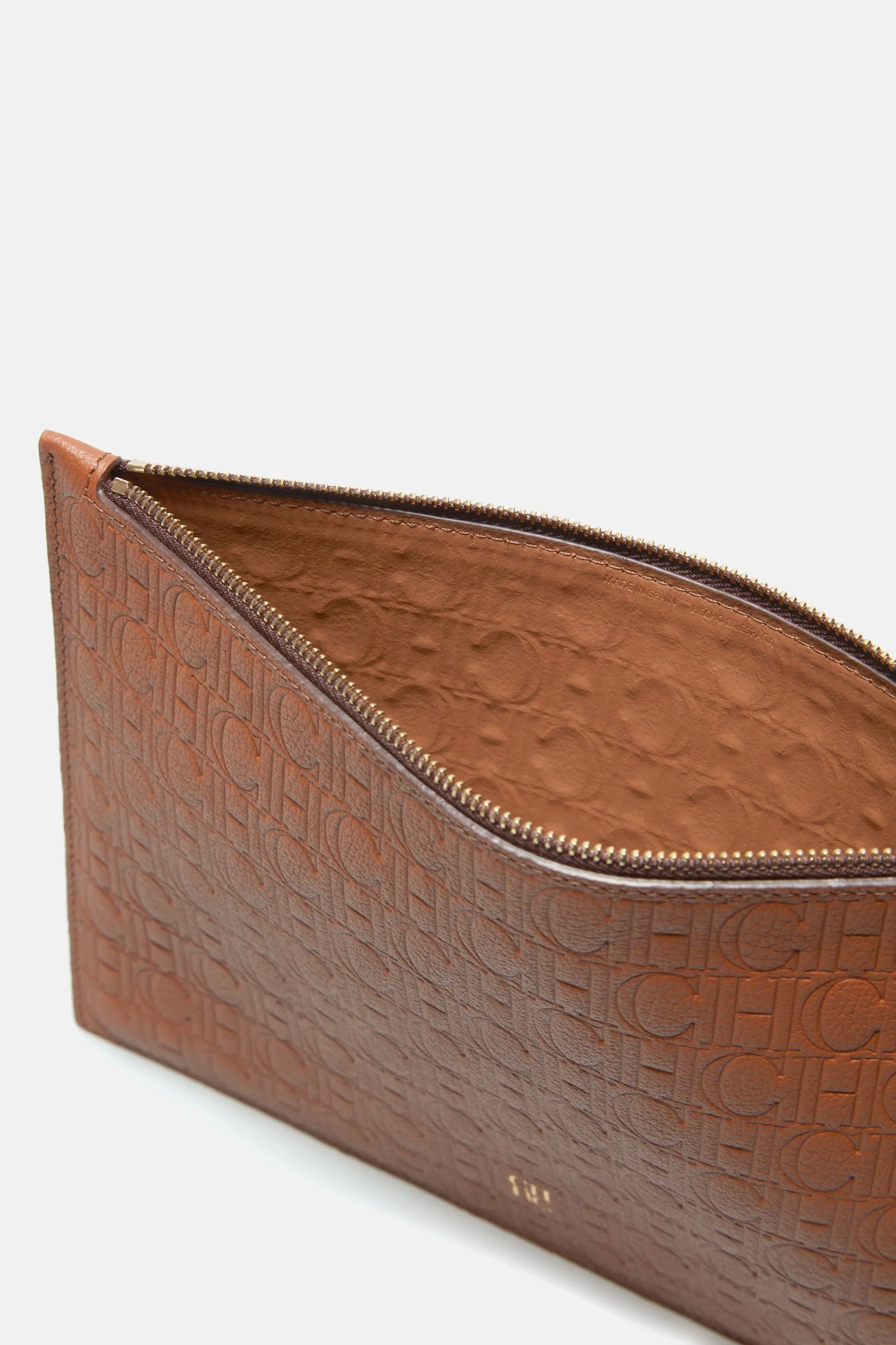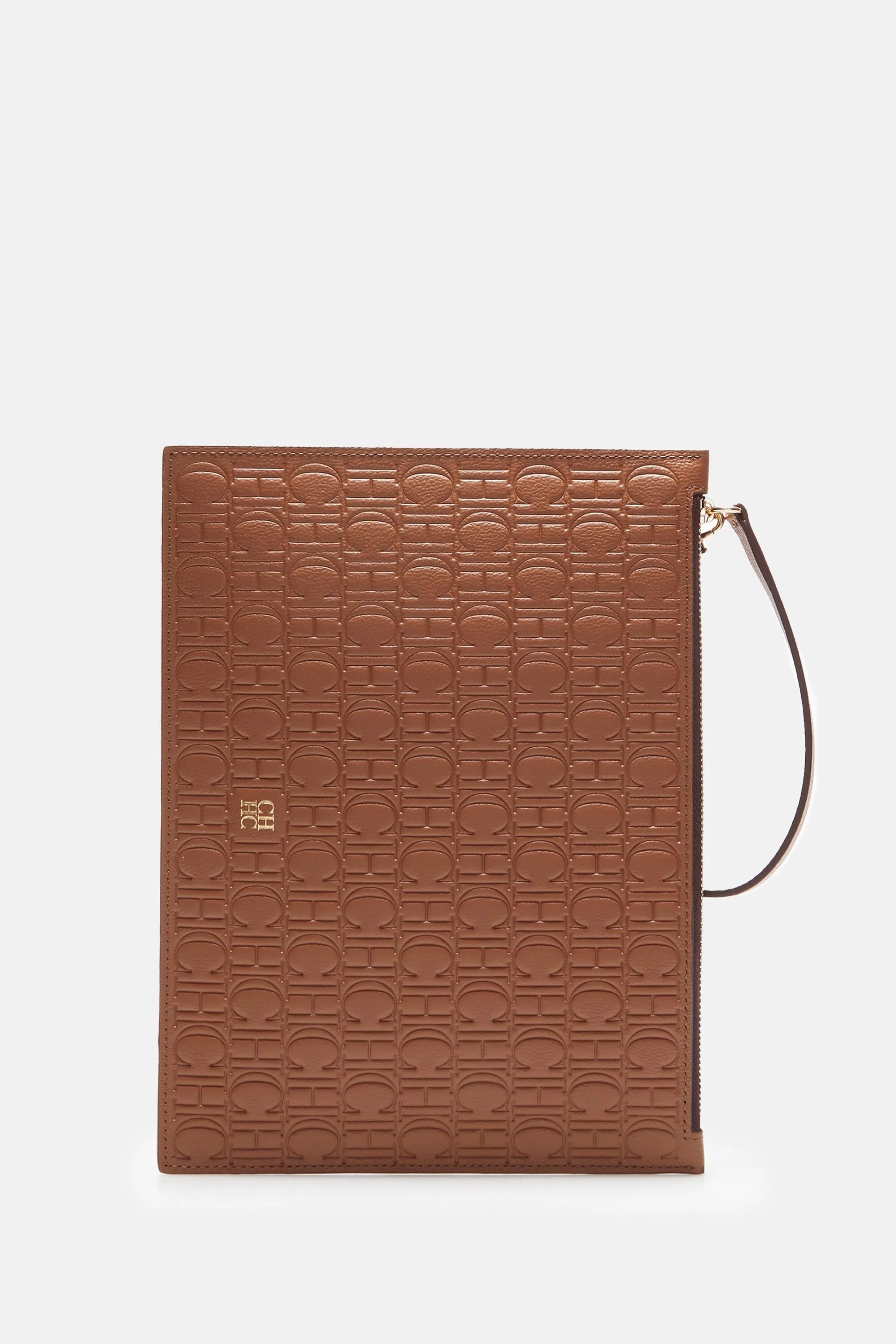 حقيبة متوسطة الحجم من جلد سيكويا، بحبيبات عادية، تحمل شعار كارولينا المنقوش. مزودة بحزام معصم قابل للإزالة، ويمكن حملها باليد أو استخدامها كمنظم للحقائب.