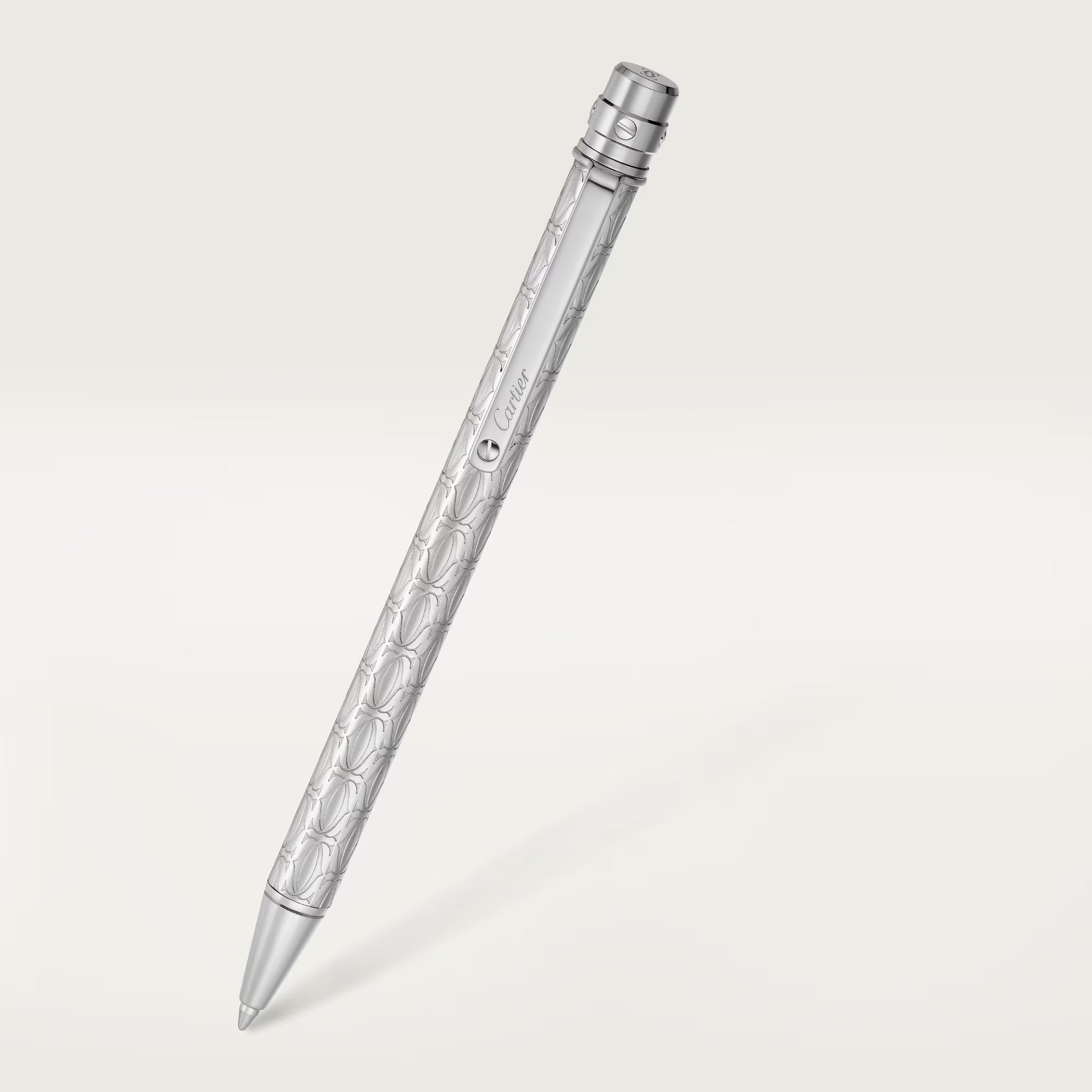 قلم حبر جاف سانتوس دي كارتييه، موديل صغير، هيكل معدني مطلي بالبلاديوم بنقش حرف C دي كارتييه، برغي وتفاصيل مطلية بالبلاديوم. الأبعاد: ١٢٥ × ٨ مم. يأتي مع خرطوشة قلم حبر جاف، حبر أزرق، حجم متوسط.