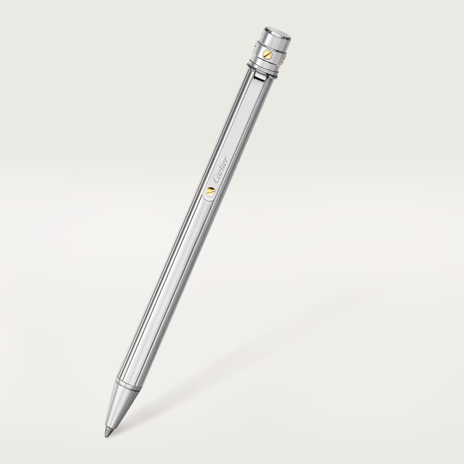 قلم حبر جاف سانتوس دي كارتييه، موديل صغير، هيكل معدني مطلي بالبلاديوم بنقشة زخرفية، وتفاصيل مطلية بالبلاديوم، وبرغي مطلي بالذهب عيار ١٨ قيراطًا (٧٥٠/١٠٠٠). الأبعاد: ١٢٥ × ٨ مم. يأتي مع خرطوشة قلم حبر جاف، حبر أزرق، حجم متوسط.