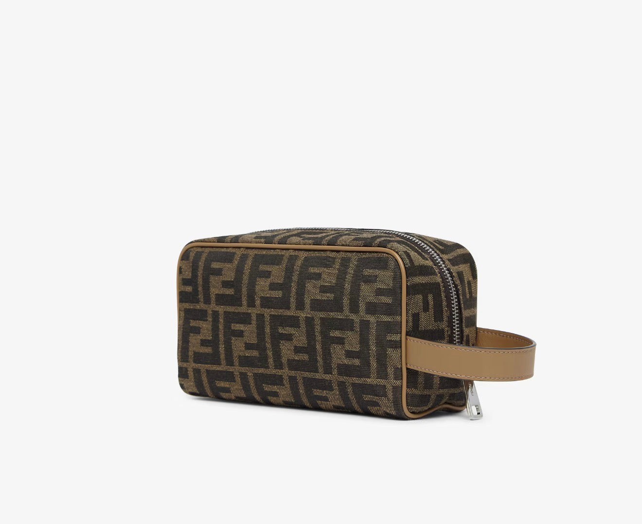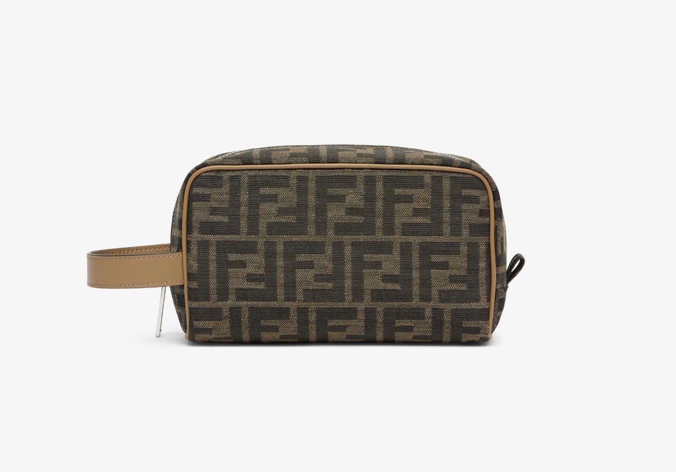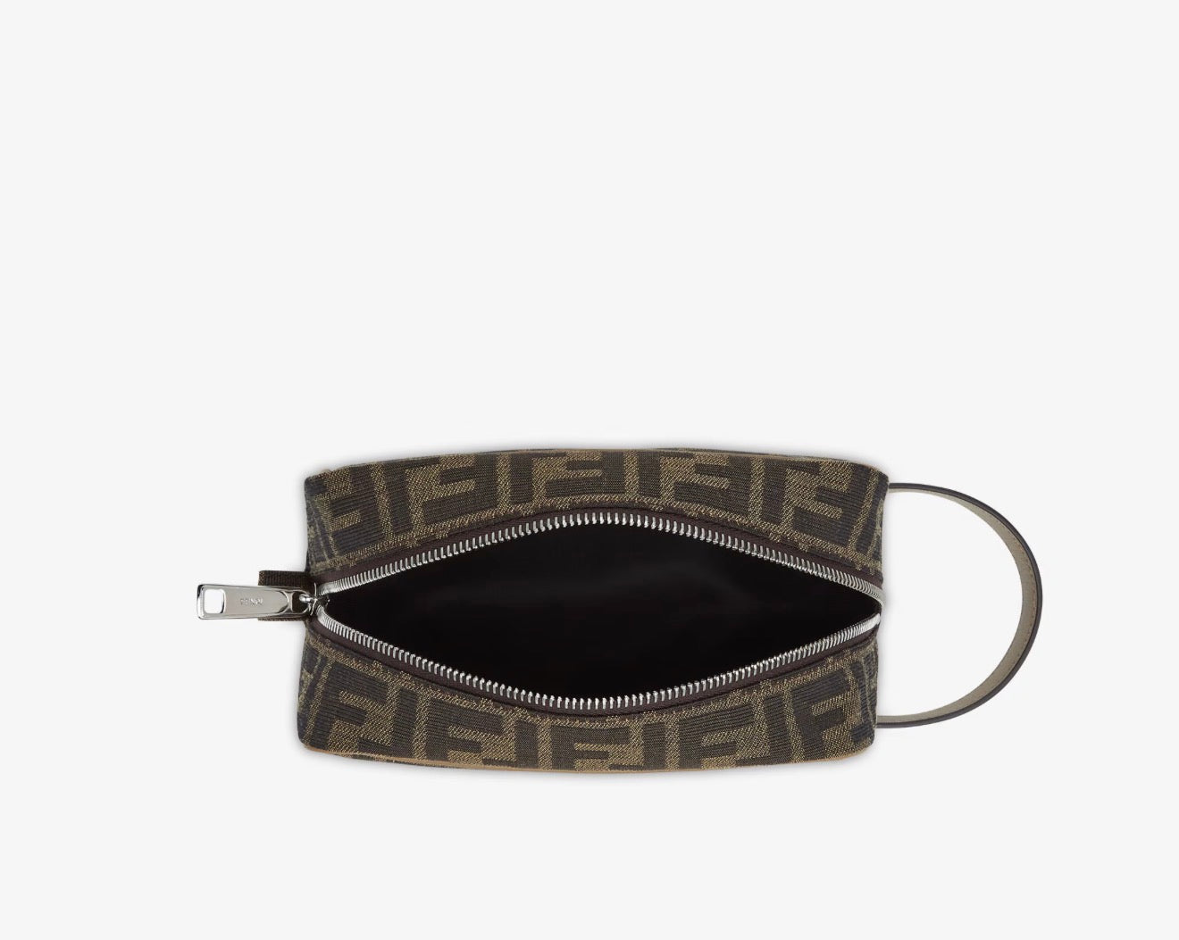 حقيبة أدوات تجميل صغيرة بسحاب. مصنوعة من قماش جاكار بني بشعار FF. مزينة بمقبض جلدي بيج. بطانة قماشية قابلة للغسل. مصنوعة من معدن مطلي بالبلاديوم.